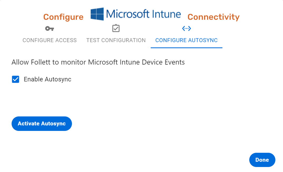 Autosync lets Follett monitor Microsoft Intune device events. When a change is made in Microsoft Intune, it will automatically be processed in Destiny based on the configured settings.